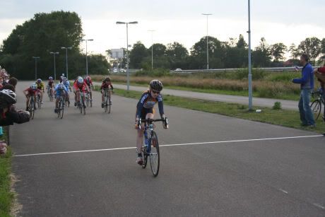 Na afgelopen zaterdag alweer naar Amersfoort, nu voor een competitiewedstrijd. Frans had de nieuwe wielen voor mij bij zich, ik rijd nu op tubes. De meest sterke concurrenten waren er vandaag niet, ondanks dat stonden we toch met 15 renners aan de start. Vandaag niet te hard van start dus de eerste ronde bleven we bij elkaar. In de tweede ronde een kopgroep gevormd met Mees en Laura. Een aantal ronden met z'n drieen gereden, maar toen moest Laura lossen. In de laatste ronde bij Mees weggereden en vandaag dus een keer geen eindsprint.