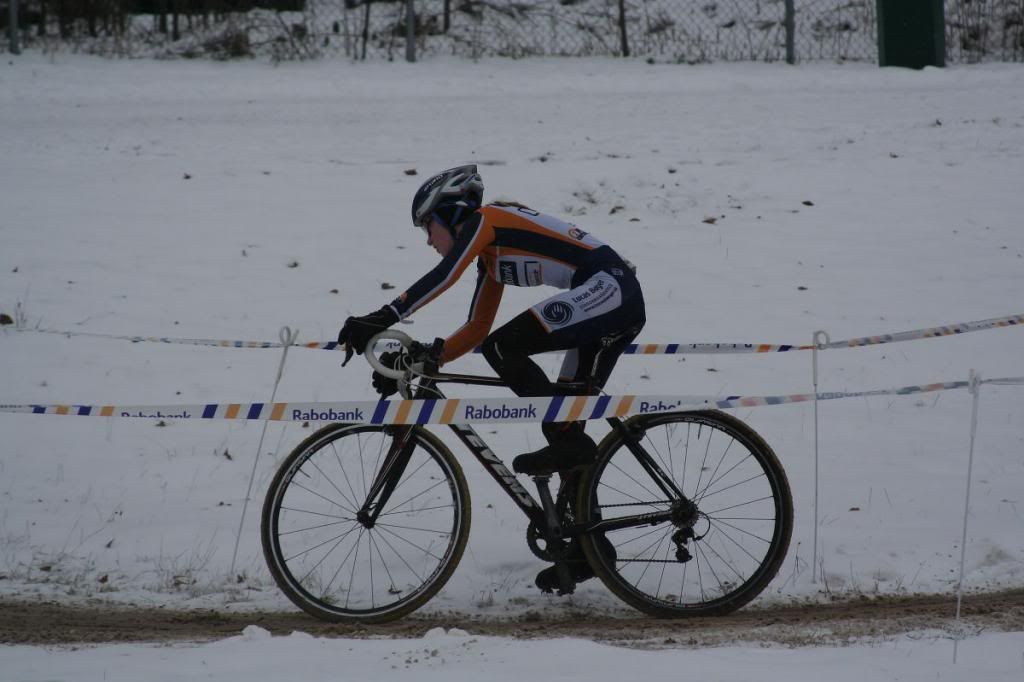 Vandaag de laatste wedstrijd voor het NK, dat volgende week in Moergestel wordt verreden. Onderweg naar Hapert hadden we al sneeuw. Het parkoers lag er wel redelijk bij, en tijdens het inrijden voelde ik me super goed. Een paar renners waren er niet, maar toch stonden we nog met 35 renners aan de start. Mijn start was niet echt geweldig maar kon gedurende de eerste ronde toch nog wat goed maken op de kop van de wedstrijd. Vanaf de derde ronde ging het steeds moeizamer, mijn benen wilden niet meer. Langzaam maar zeker verloor ik steeds meer plaatsen. Gezien mijn gevoel tijdens het inrijden had ik wel gehoopt op een top tien plaats, maar meer dan een 16e plaats zat er vandaag niet in. Waarschijnlijk weten we de oorzaak wel en zal ik er hopelijk met het NK geen last van hebben.