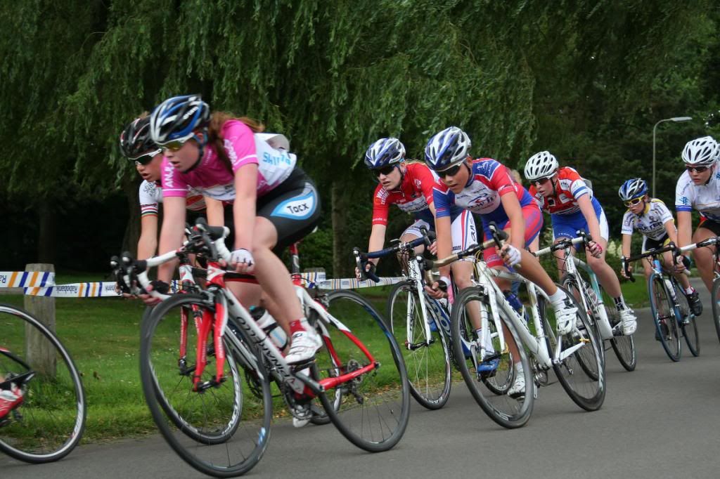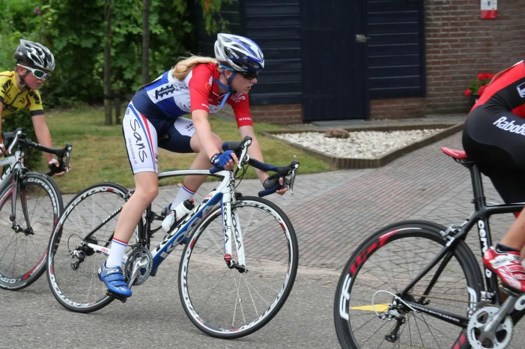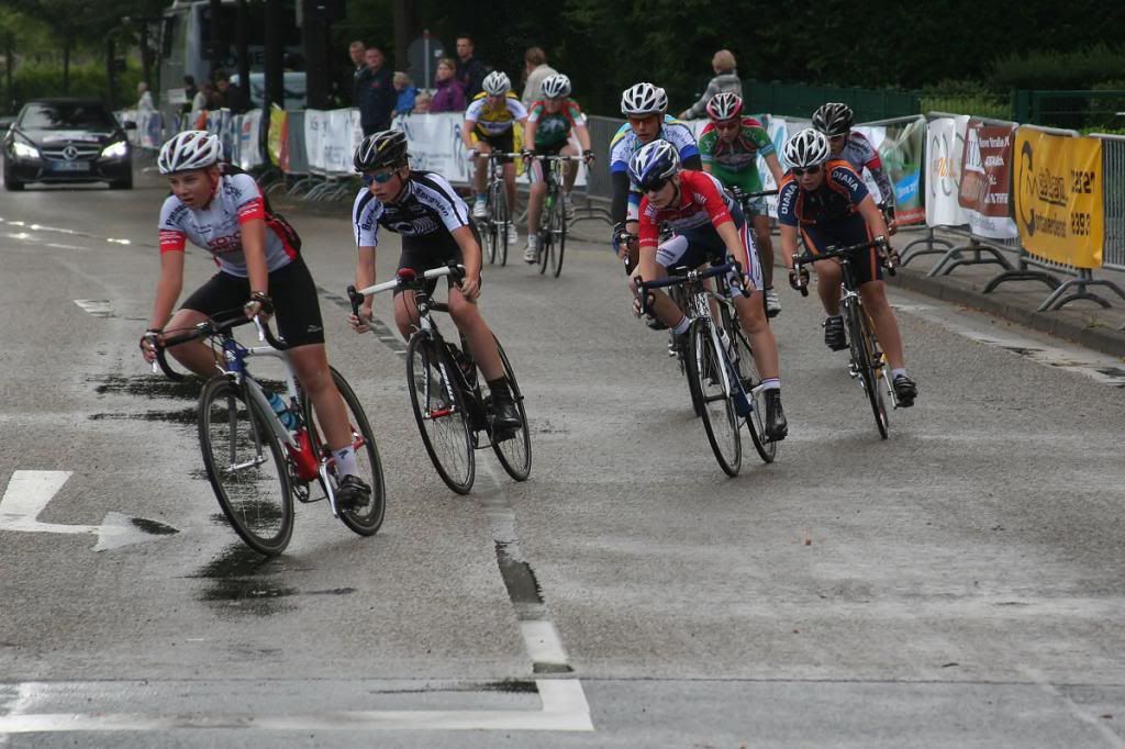 Een mooi, maar bochtig parcours en gelukkig was het droog. We stonden met 52 renners aan de start voor 15 ronden. Mijn loting was ongunstig en kon pas als één na laatste aansluiten. Mijn eerste doel was dus, om voorin te komen. Maar dat viel niet mee, want de eerste gingen meteen hard van start. Bij de eerste doorkomst zat ik gelukkig in het eerste peloton. Na een paar ronden waren we nog met 22 renners over, 3 meisjes en de rest allemaal sterke jongens. We bleven bij elkaar en het werd weer een sprint. Ik eindigde als 10e en ben wel tevreden, want er werd best wel hard gereden.