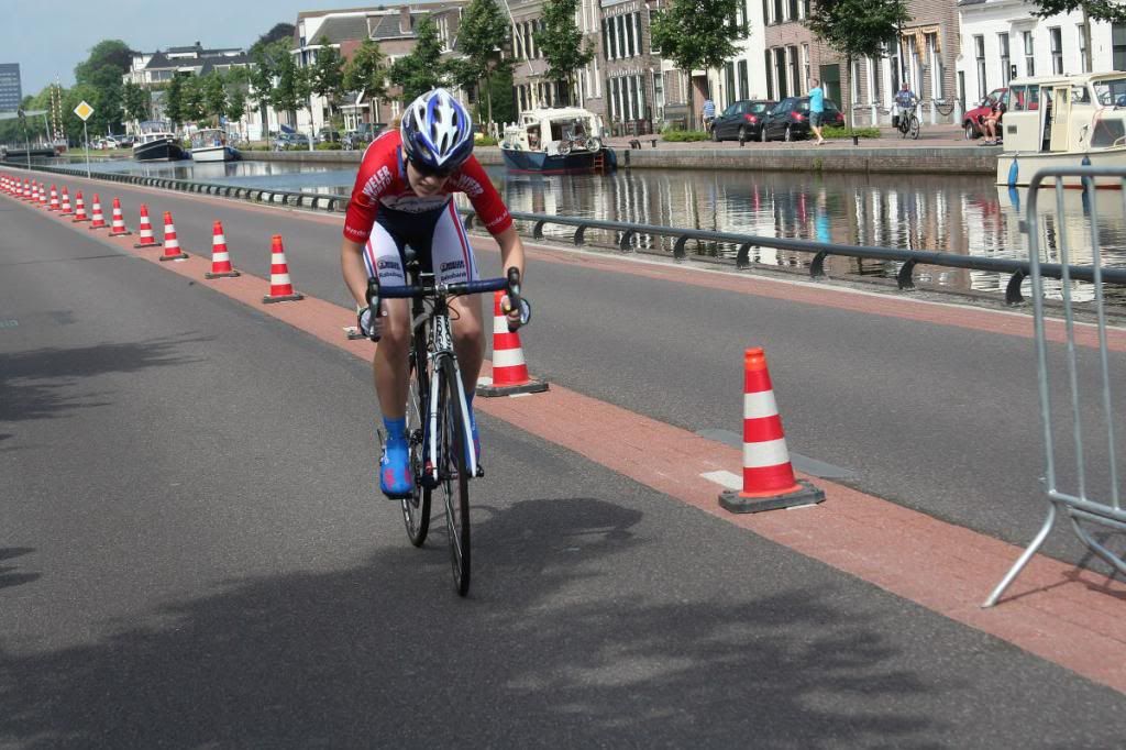 Aangezien er toch niet echt een mogelijkheid was om goed in te rijden op het parcours zijn we later vertrokken en heb ik ingereden op de rollers. Om 11:11 uur was het mijn beurt voor de tijdrit over 980 meter, heen en terug langs de vaart met dus halverwege een haakse bocht. Het was de eerste keer voor mij dat ik dit parcours reed en heb achteraf te vroeg voor de bocht geremd. Ik had de negende tijd. Jammer genoeg een halve seconde te langzaam, anders had ik morgen in het roze mogen starten….