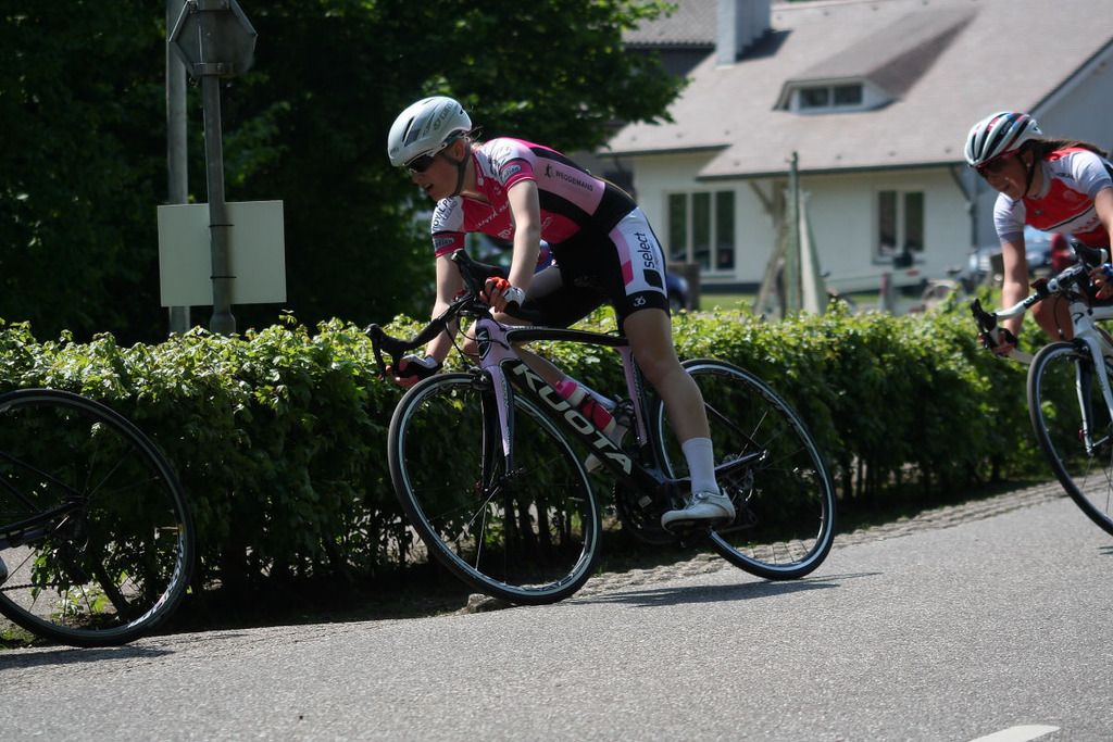 Vandaag het regiokampioenschap van de districten Midden- en Oost-Nederland. Normaal rijden we een eigen Districtskampioenschap, maar omdat er in Oost geen organisatie het kon organiseren reden de dames uit Oost met ons mee. Dit betekende dus wel een grotere groep. We stonden met 36 meiden aan de start voor 19 ronden. Er werd, zeker in het begin, goed door gereden, zodat we op een gegeven moment de junior-dames inhaalden. Niet veel later demarreerden Anne, Jennifer en Micha. Ze werden niet teruggehaald en konden hun voorsprong ronde voor ronde uitbouwen. Voor het peloton zat er niet meer in dan een eindsprint voor plaats vier. Zelf probeerde ik in de laatste ronde uit het gedrang te blijven door te proberen weg te rijden. Dat lukte niet echt maar bleef wel goed voorin. Ik verzuurde misschien daardoor iets te vroeg, waardoor ik derde werd van het peloton, dus zesde in de totaaluitslag. Ik ben tevreden.